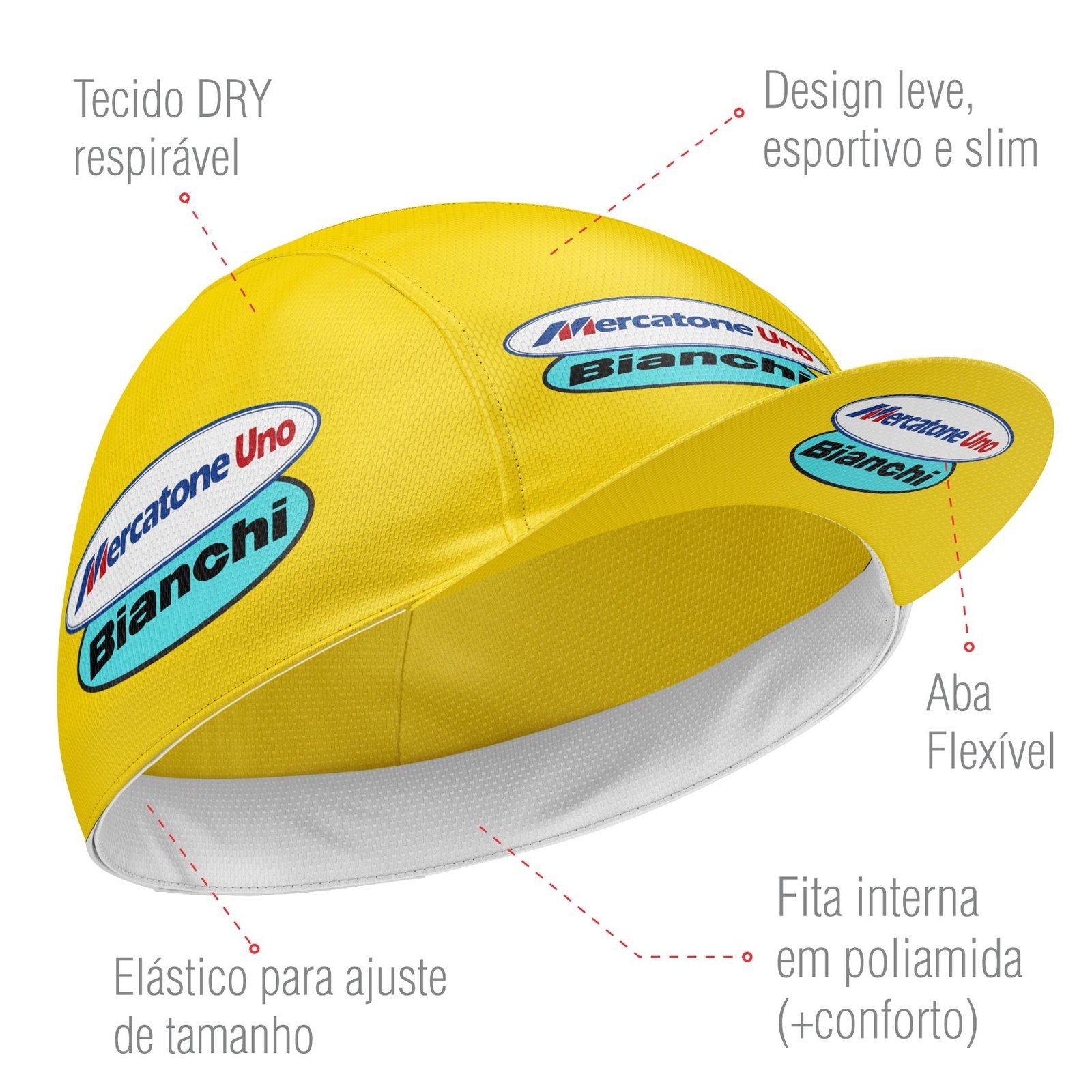 Com o tradicional Celeste Bianchi, cor símbolo da marca italiana, e detalhes que remetem ao legado de Pantani, o cap combina elegância clássica com funcionalidade. Feito em algodão leve e respirável, oferece conforto durante pedaladas intensas, protegendo do sol e mantendo o suor longe dos olhos.