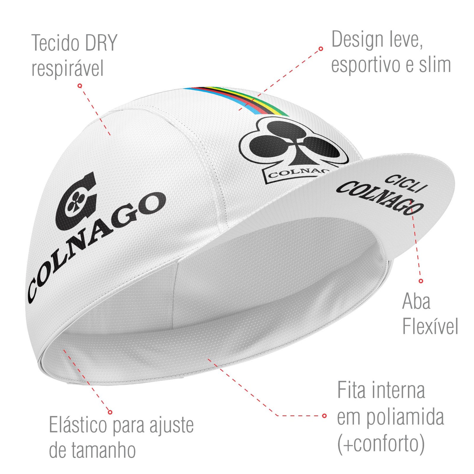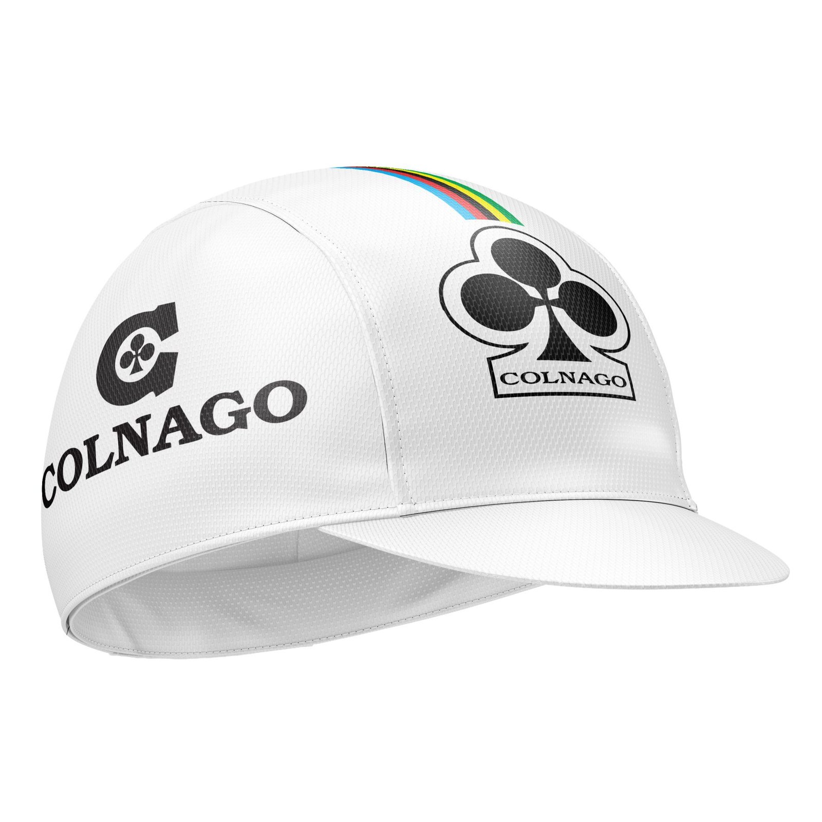 Com design clássico e o famoso trevo de quatro folhas, os caps da Colnago combinam elegância e tradição. Hoje, mantêm sua herança histórica, sendo usados tanto em treinos quanto como peça de vestuário casual, conectando ciclistas ao legado atemporal da marca.